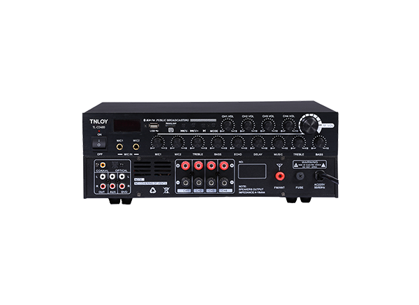 CD系列四通道定阻功放为合并式带蓝牙接收、U盘、TF卡播放、收音播放功能于一体的专业功率放大器,具有2路话筒输入,2路话筒均带效果处理器,2路线路辅助输入,可接CD卡座,调谐器电脑等,1路光纤输入,1路同轴输入,远距离音频传输无干扰。话筒及线路音量均独立可调。并设有独立的音调控制及总音量控制使输出音色亦能方便调节.还设有线路输出,可用于录音或连接其它功放当音源使用。人性化的设计,LED显示屏,可选带遥控器,简洁美观的操控面板,高保真的音响氛围使您的生活和工作更加轻松愉快。